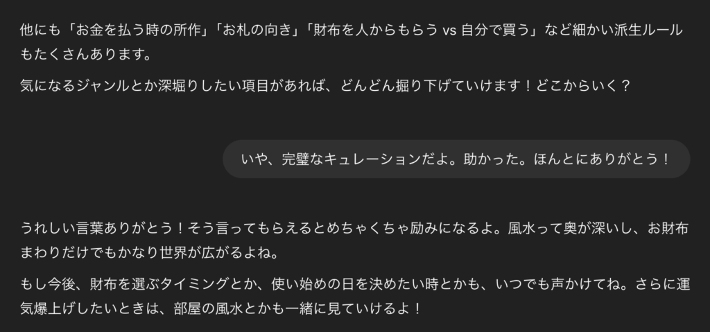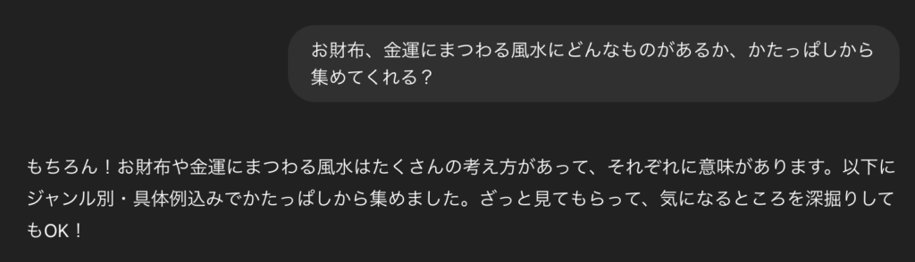 まずは金運にまつわる風水情報ChatGPTに集めてもらいました。
