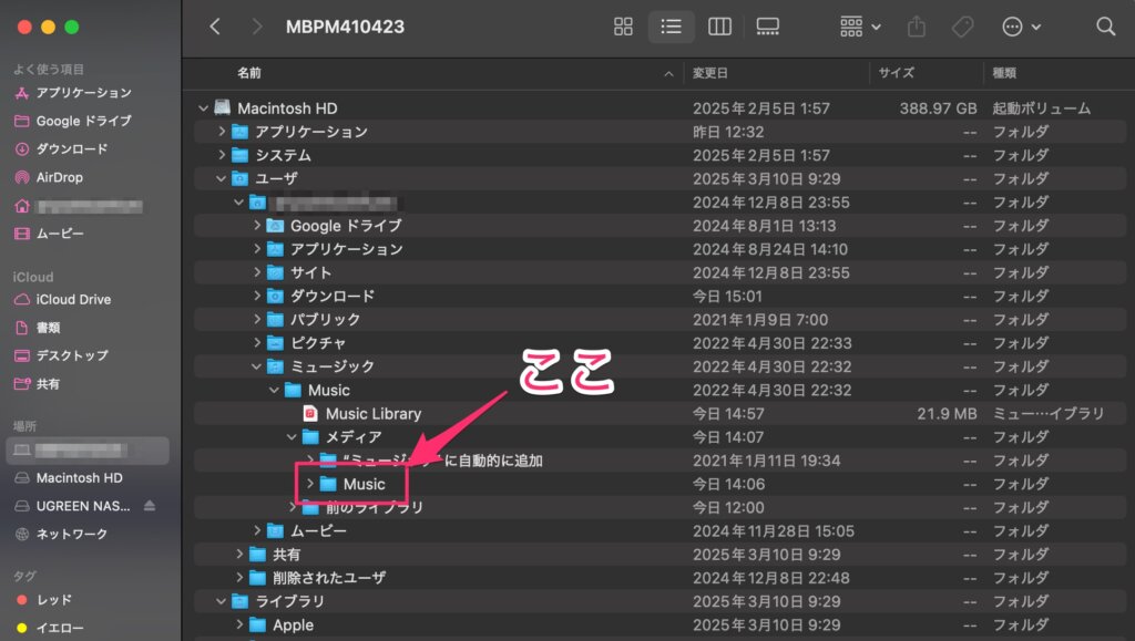 個人フォルダの中にMusicフォルダがあることを確認します。