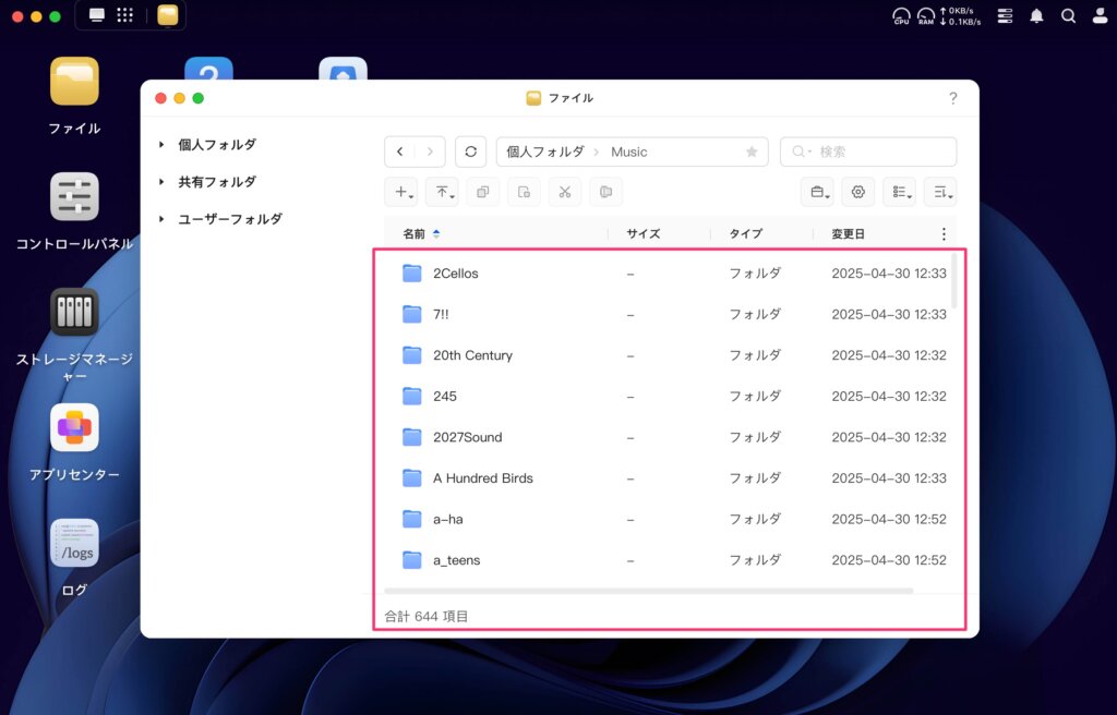 に全部入っていたので、このフォルダごとドラッグアンドドロップでNASyncのMusicフォルダに移動させます。