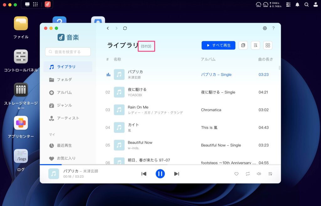 ミュージックプレイヤーが立ち上がり、ちゃんと音楽データを読み込んでくれていることがわかりました。