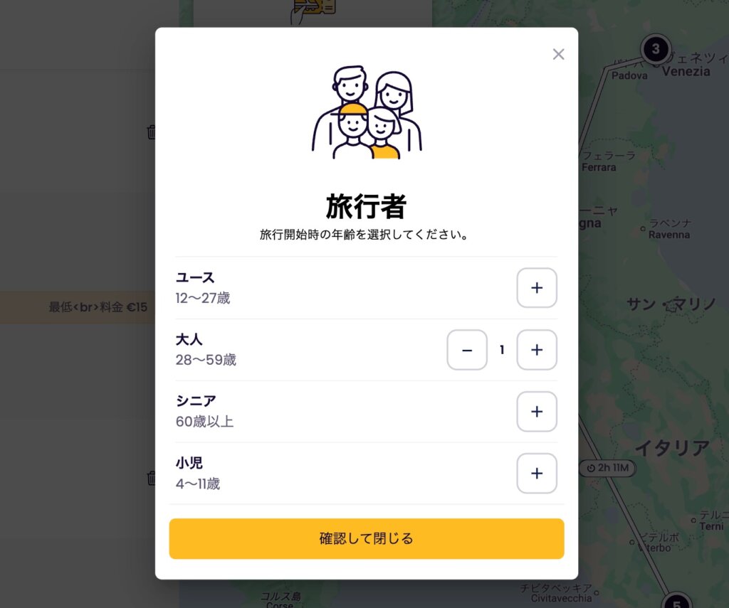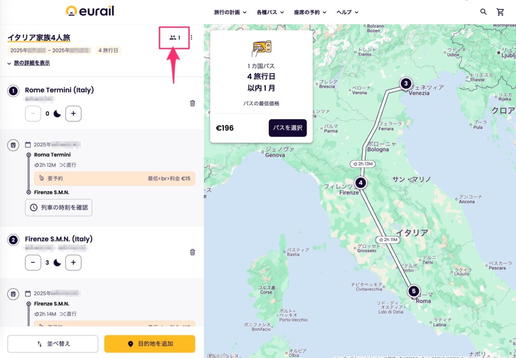 旅行タイトル横の人型アイコンをクリックすると、旅行者数を入力できます。