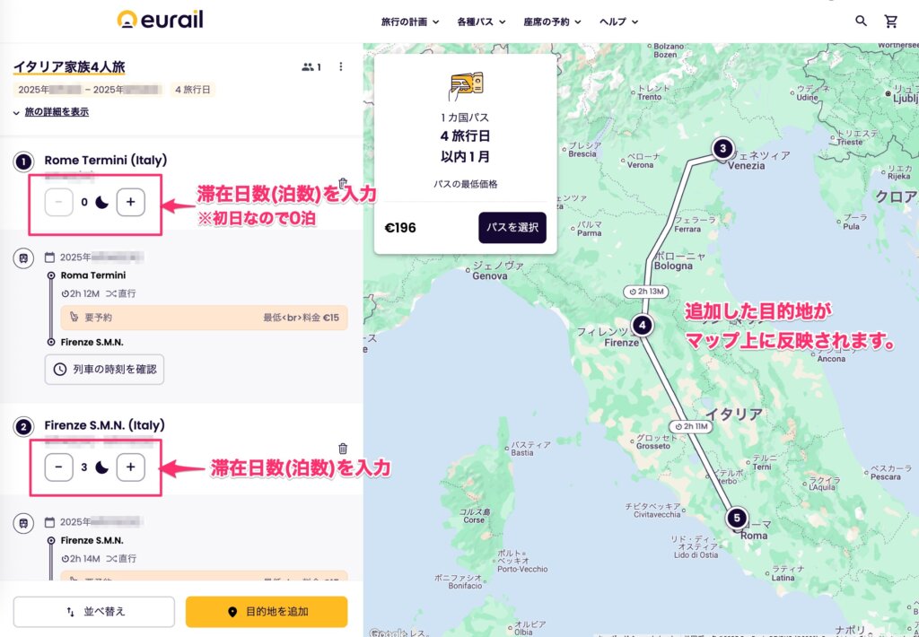 駅名の下の+・ーボタンをクリックすることで、滞在日数(泊数)を反映させることができます。
