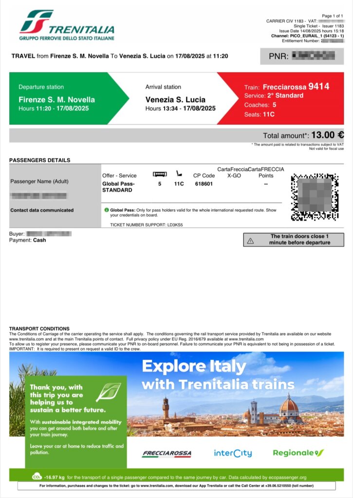 フィレンツェ発・ベネチア行きの列車予約で13ユーロかかりました。