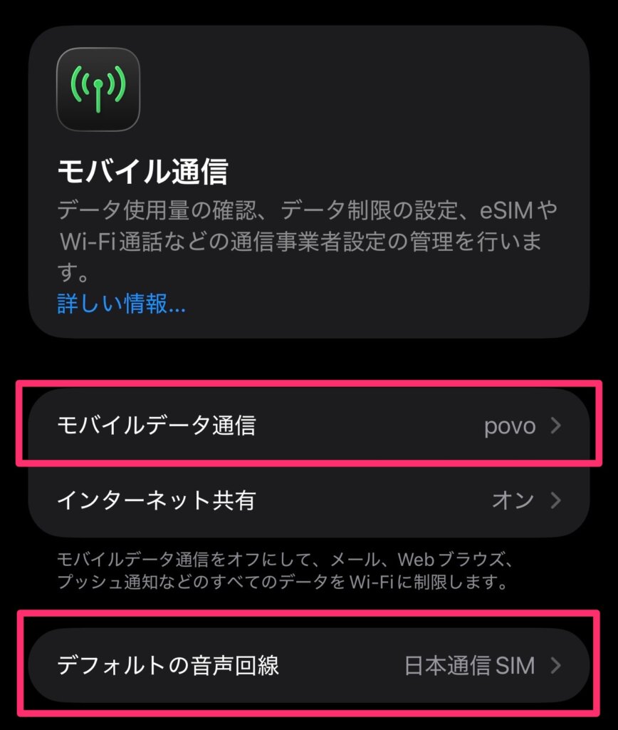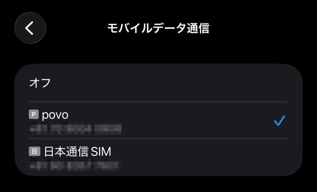 僕はすでにpovo回線を持っているので、トッピングしてモバイルデータ通信をpovoに設定すればデータ通信メイン回線のpovoへの置き換えは完了。