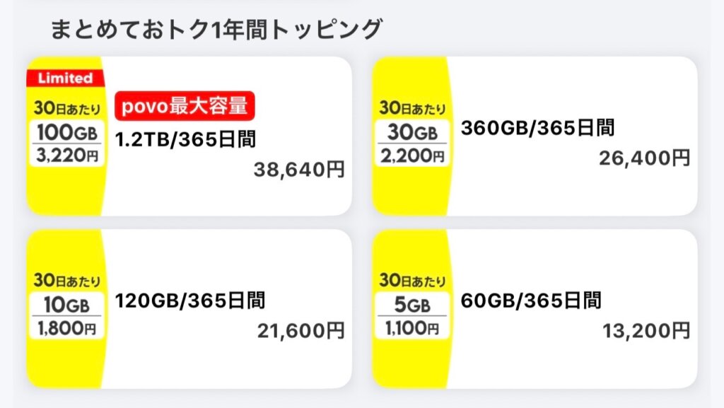 期間限定トッピングにうまくタイミングが合えばもっとお得に利用できます。左上の1.2TB/365日間は30日あたり100GBで3220円!