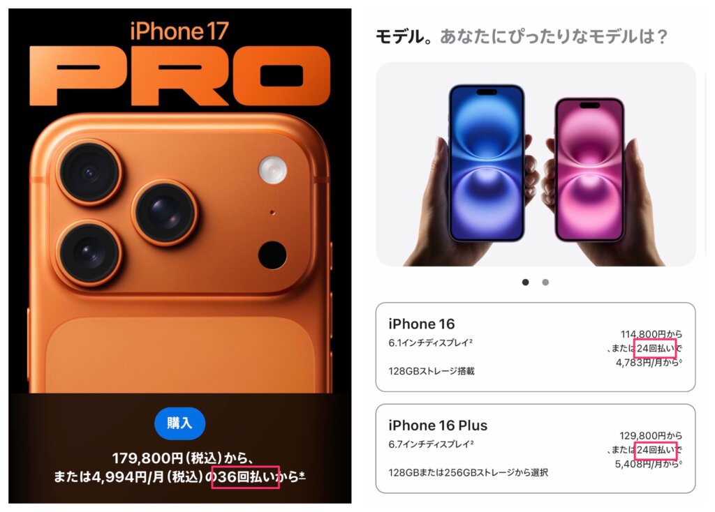 - 最新iPhoneは36回分割